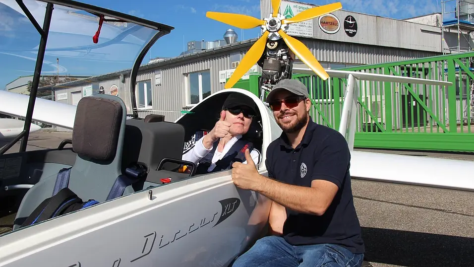 Daumen hoch für das große Segelflug-Abenteuer: Sabine und Pilot Karl Rieder, kurz vor dem Start am Flugplatz Straubing-Wallmühle.